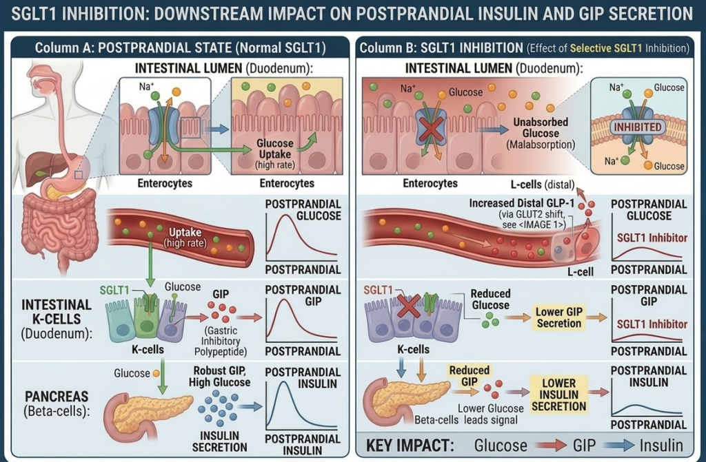 SGLT1 is the primary glucose and galactose transporter in the human small intestine and plays a secondary role in renal glucose reabsorption. Unlike sodium-glucose cotransporter 2, or SGLT2, which is localized mainly in the kidney, SGLT1 governs postprandial glucose absorption in the gut, making it a critical regulator of blood glucose excursions after meals. Pharmacological inhibition of SGLT1 reduces and delays the rate and extent of intestinal glucose uptake, blunting postprandial hyperglycemia and reducing insulin secretion as well as postprandial secretion of GIP. We believe this dual effect—attenuating postprandial glucose absorption while modulating incretin response—makes SGLT1 an attractive target for the treatment of metabolic diseases.